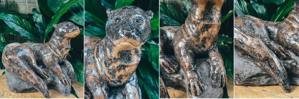 A escultura retrata uma ariranha em postura atenta e expressiva, destacando características marcantes do animal, como a postura corporal e a força de seus membros. Produzida artesanalmente em argila marfim, a peça pesa aproximadamente 3 kg e possui 21 cm de altura, 22 cm de comprimento e 14 cm de largura.