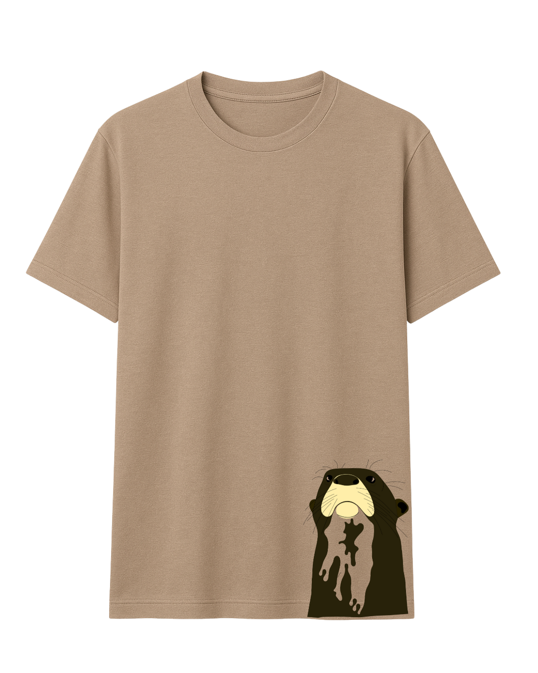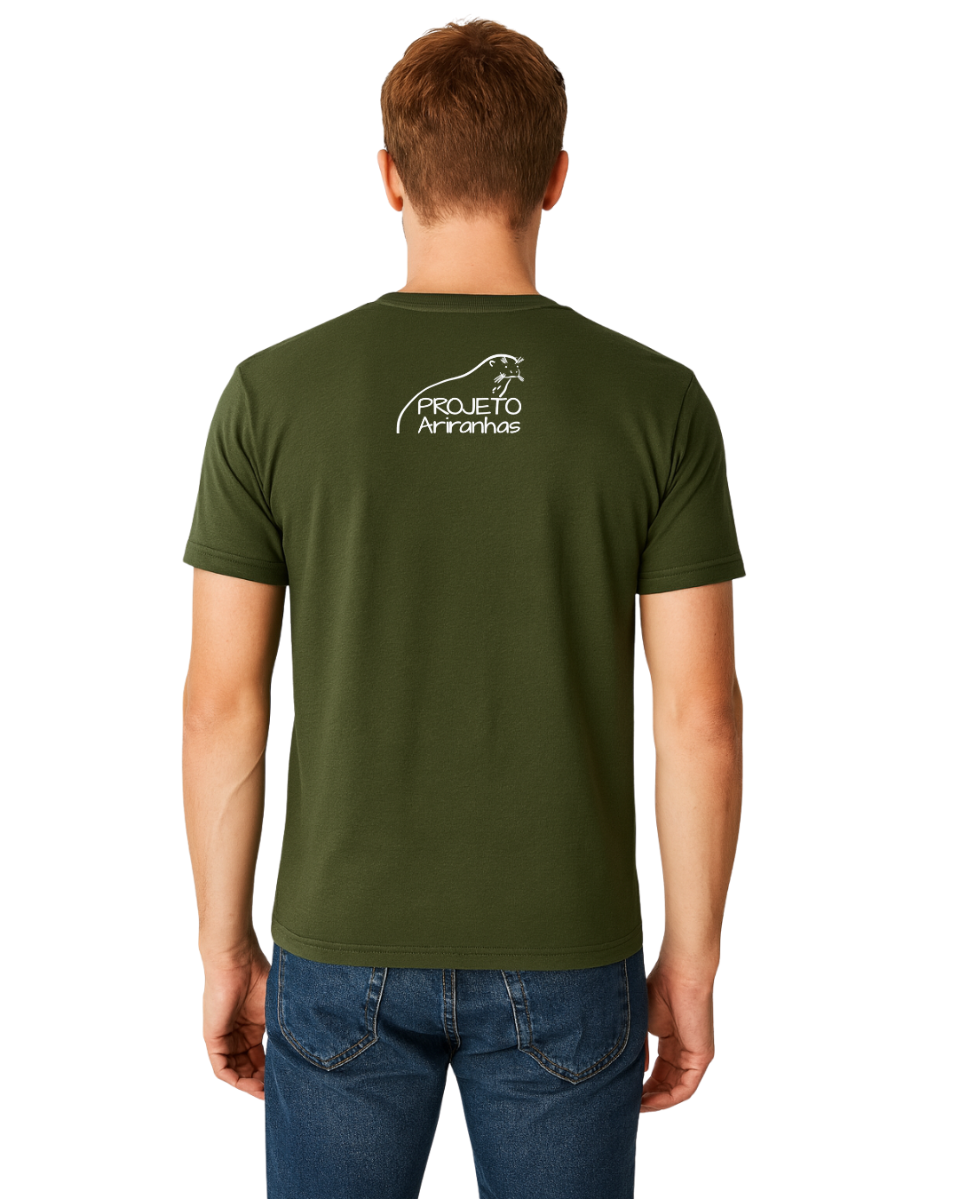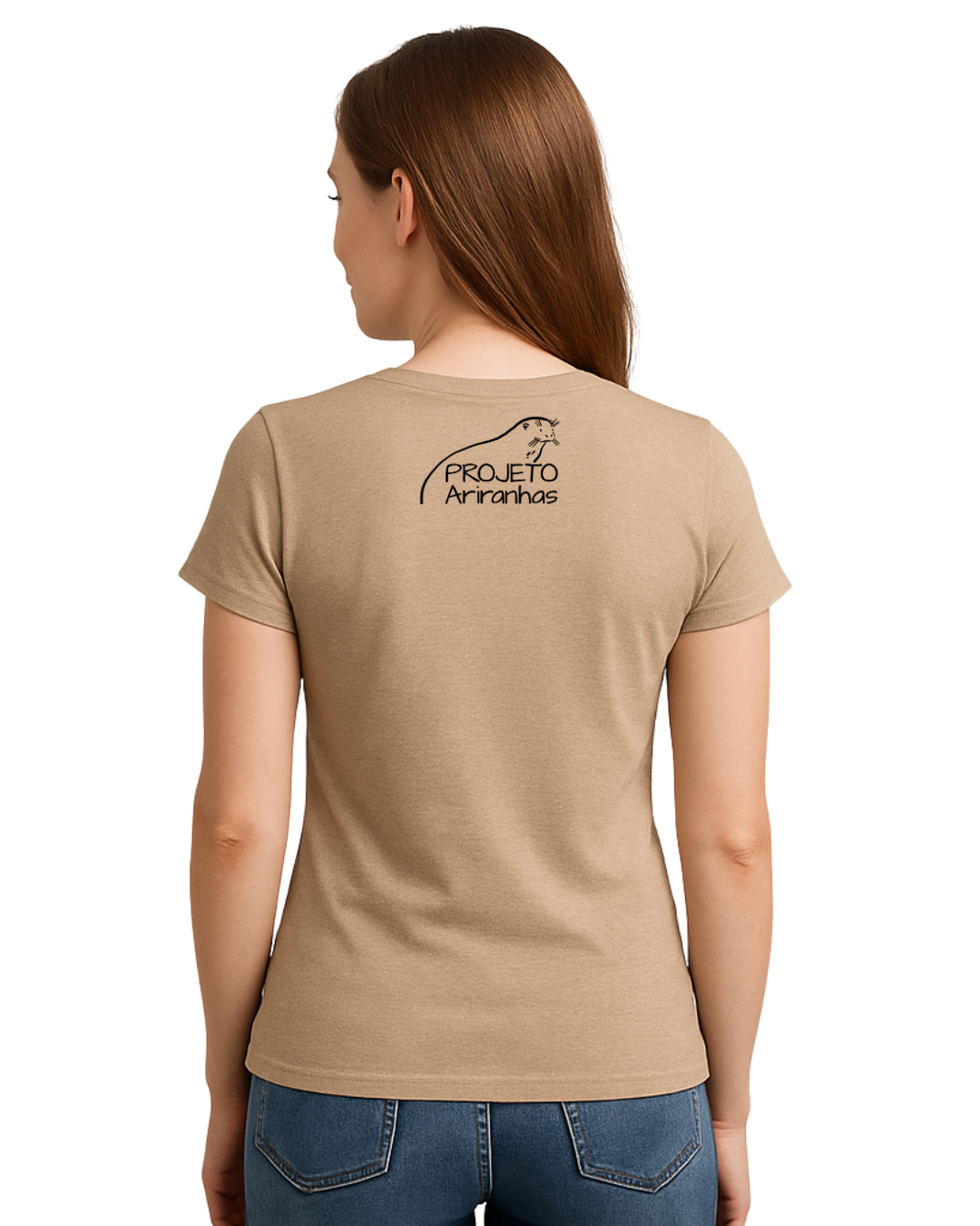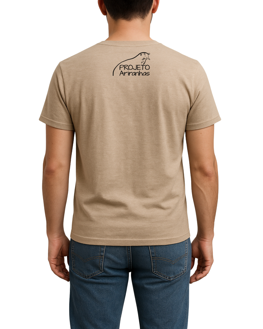 Camiseta 100% algodão sustentável. Ilustração da cabeça e pescoço da ariranha com a mancha, no canto inferior da frente (silk screen) e a logo do Projeto Ariranha na nuca..