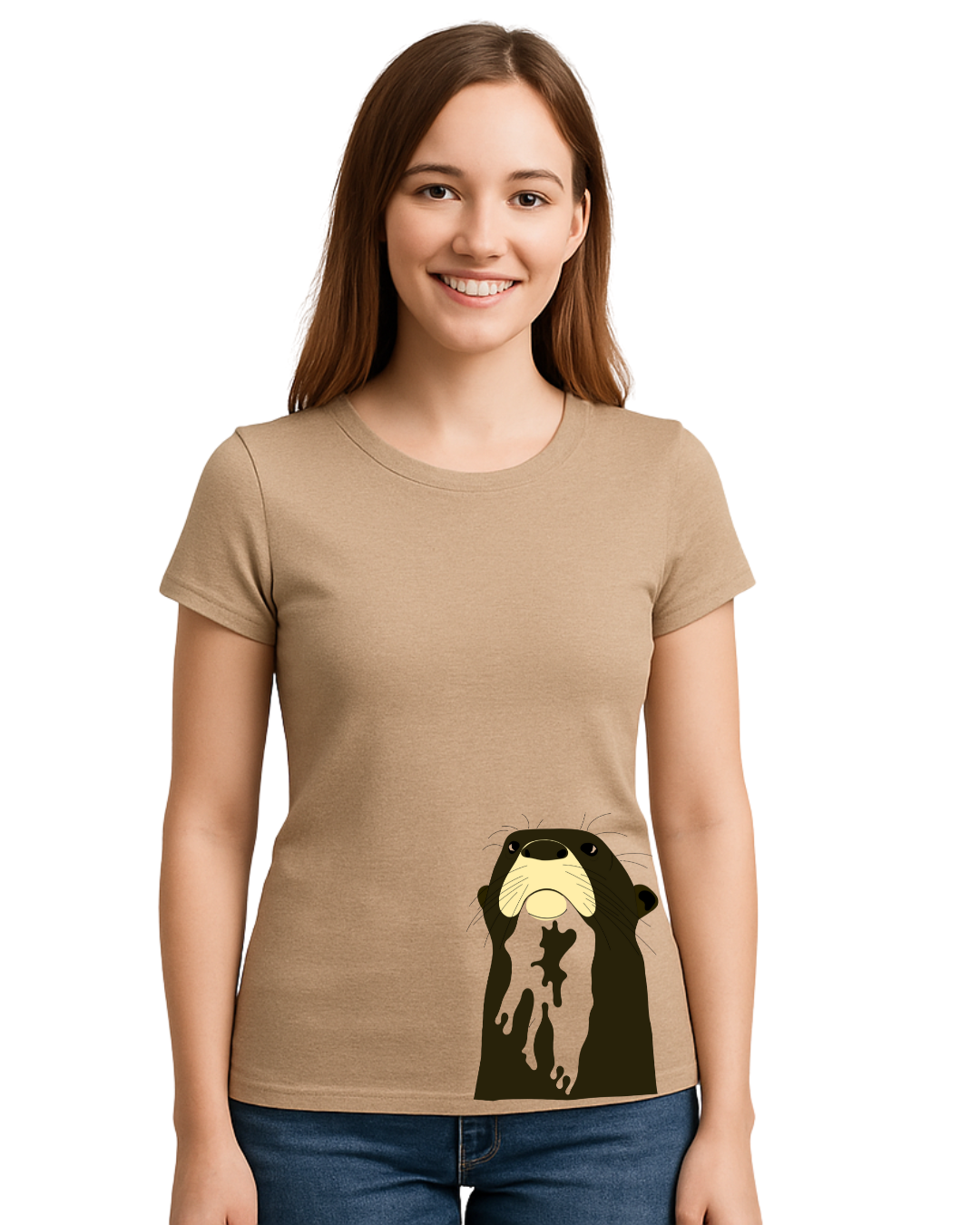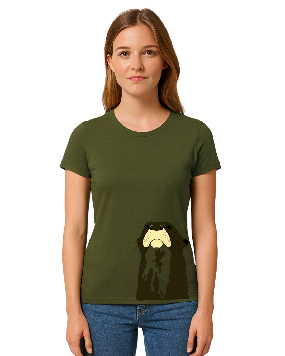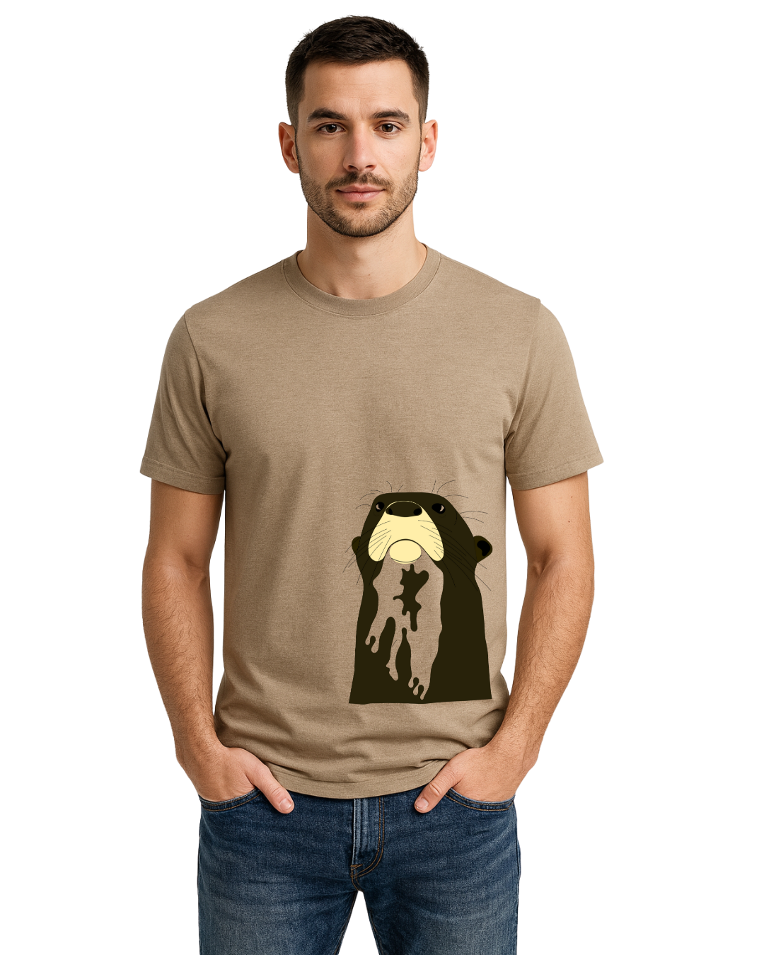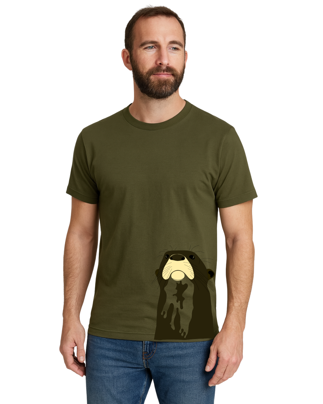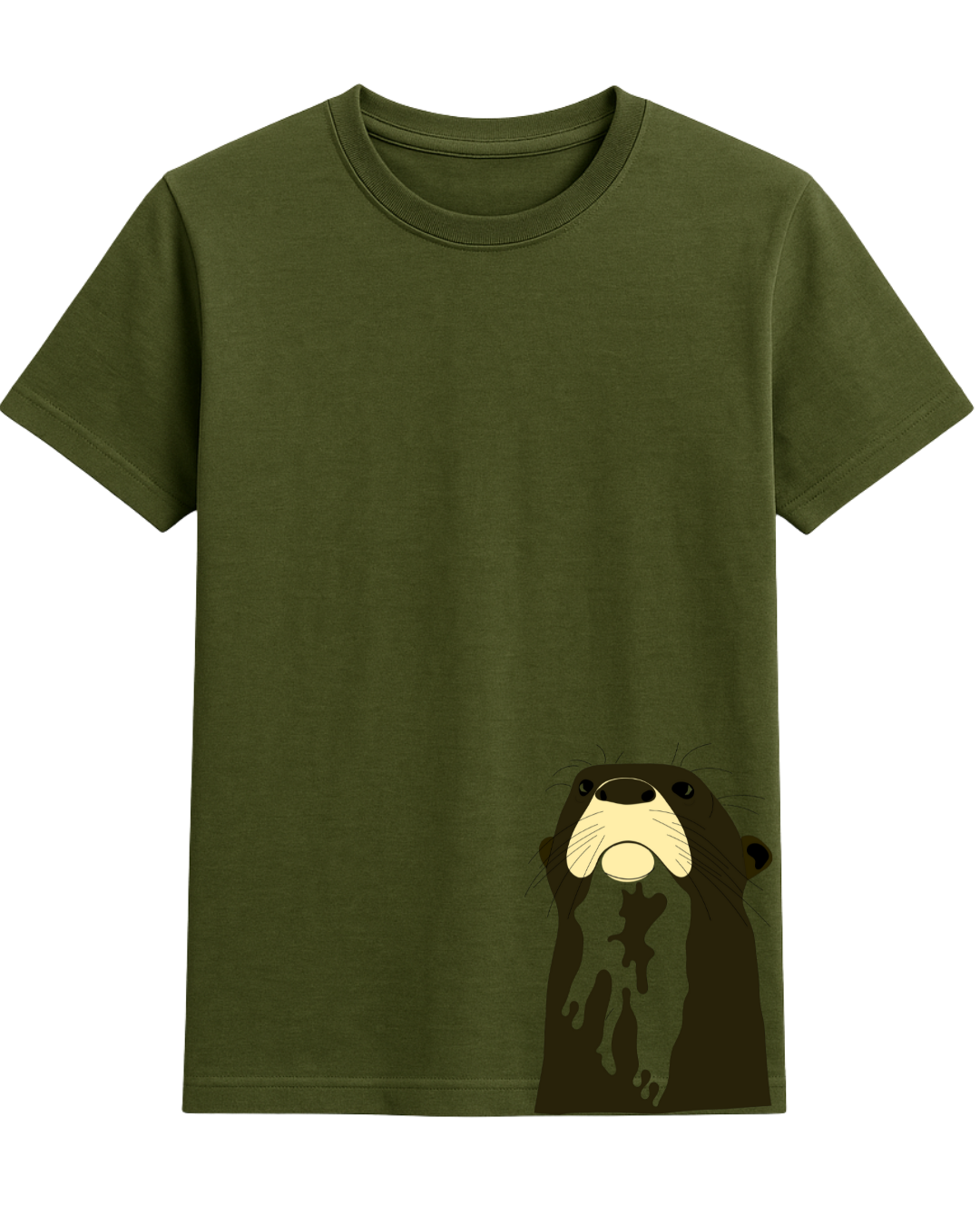 Camiseta 100% algodão sustentável. Ilustração da cabeça e pescoço da ariranha com a mancha, no canto inferior da frente (silk screen) e a logo do Projeto Ariranha na nuca..
