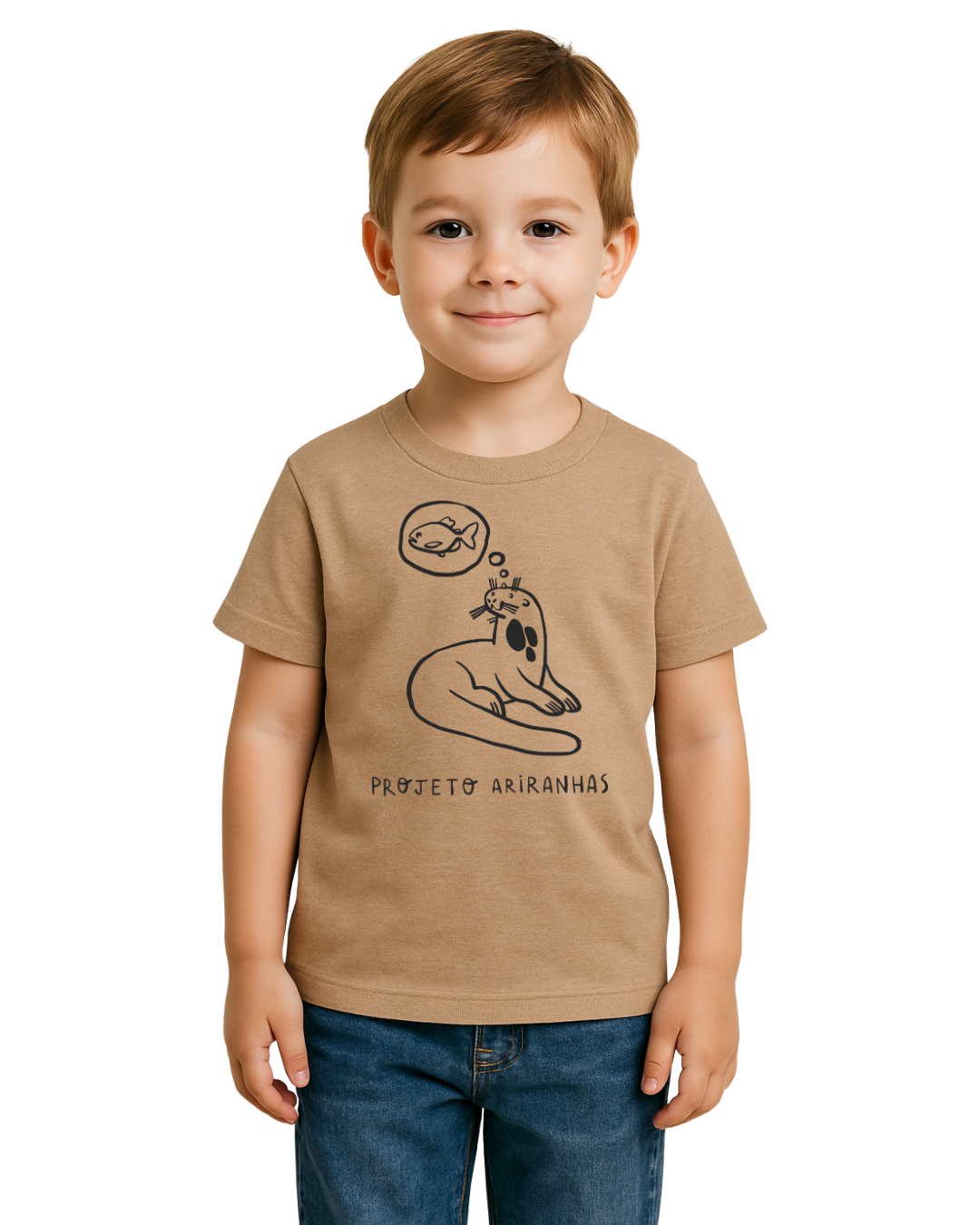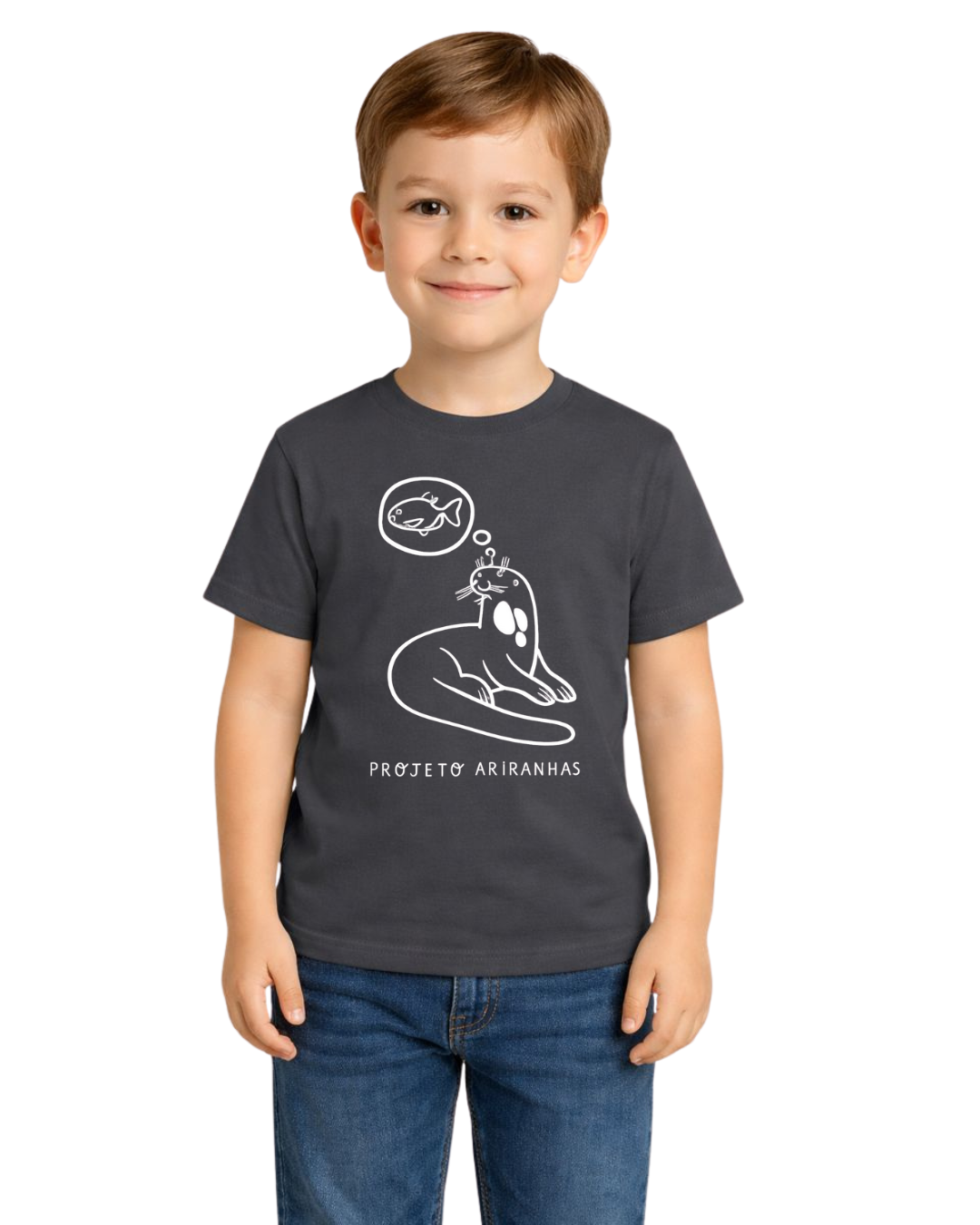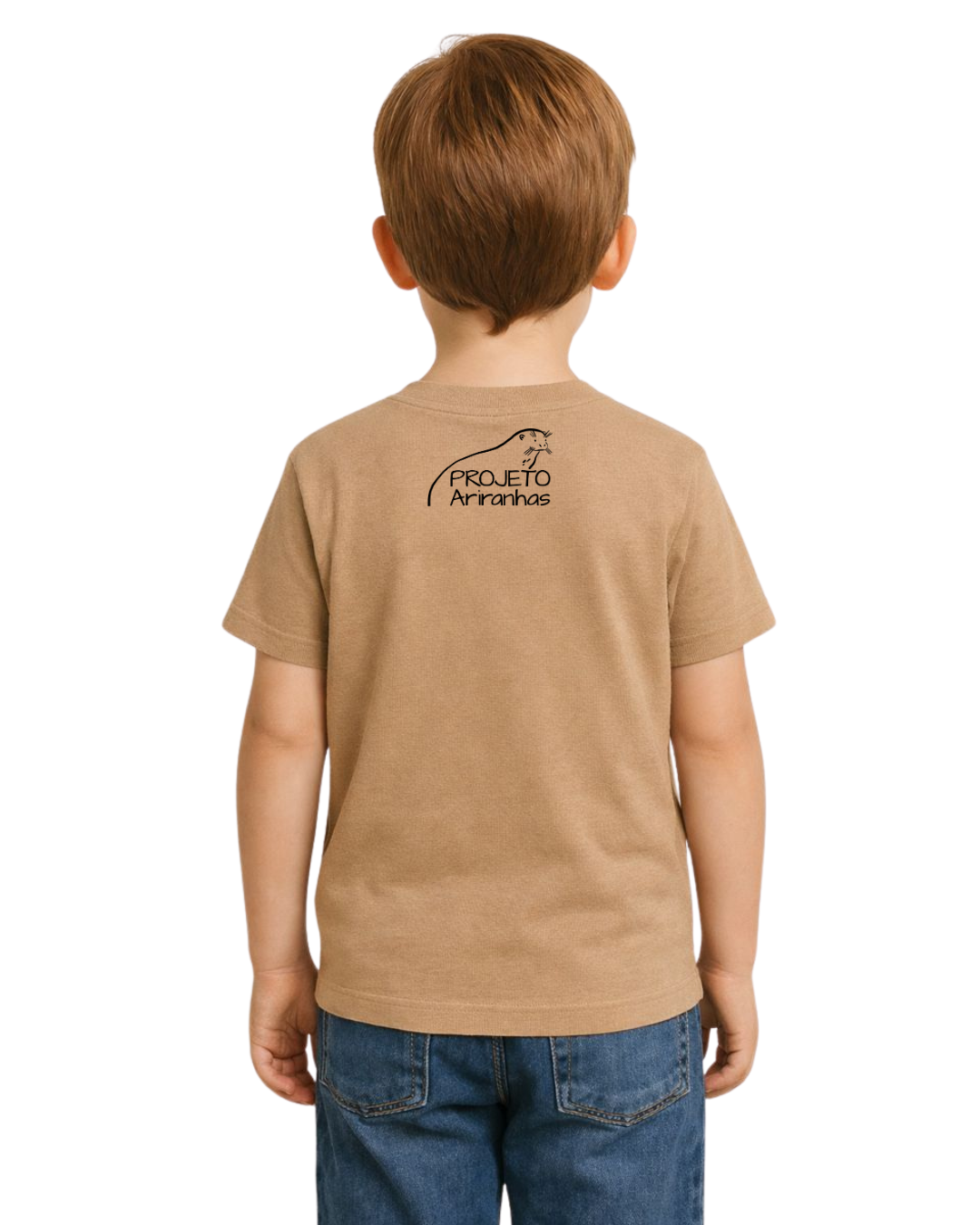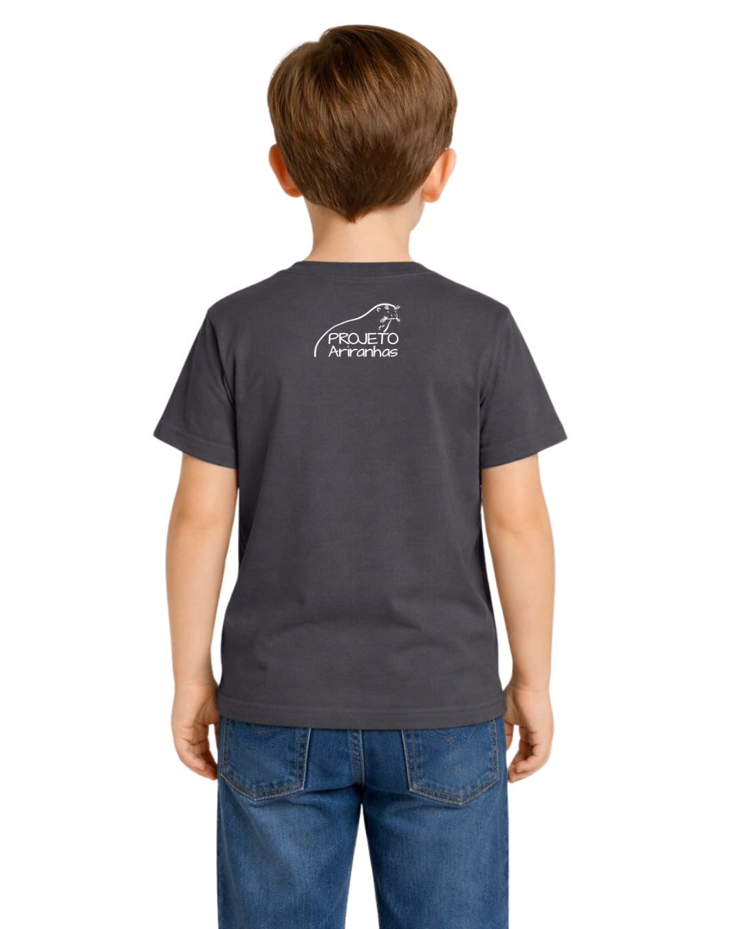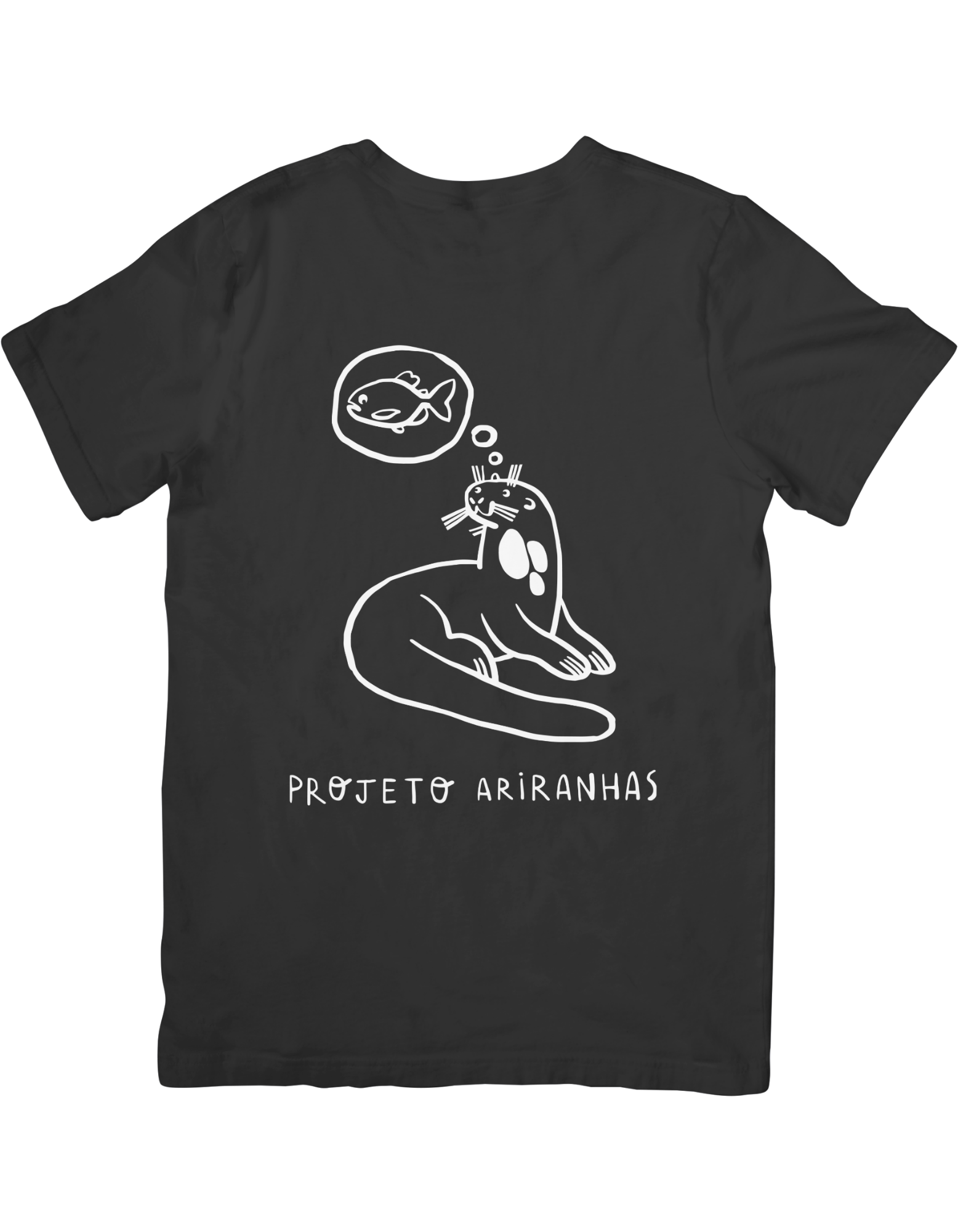 Camiseta 100% algodão sustentável. Ilustração de uma ariranhas pensando em um peixe, na altura do peito (silk creen), e a logo do Projeto Ariranhas na nuca.